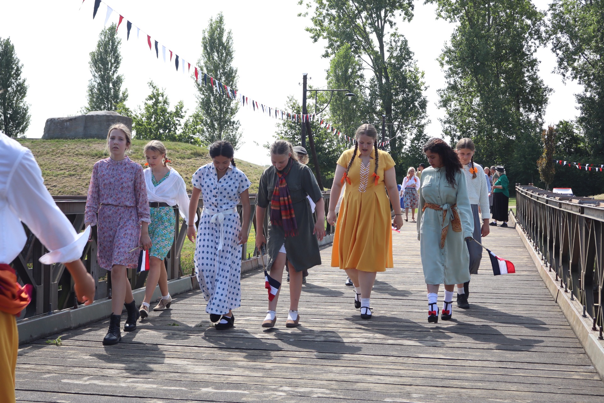 Hoewel het onderwerp zwaar is, waren de draaidagen allesbehalve somber! Met een fantastische cast en crew werd de Bevrijdingsscène bij het Bevrijdingsmuseum in Nieuwdorp een echt feest. Ondanks dat het 30 graden was, kwamen figuranten gekleed in prachtige kostuums, met vlaggetjes, linten, rokken en vlechten.